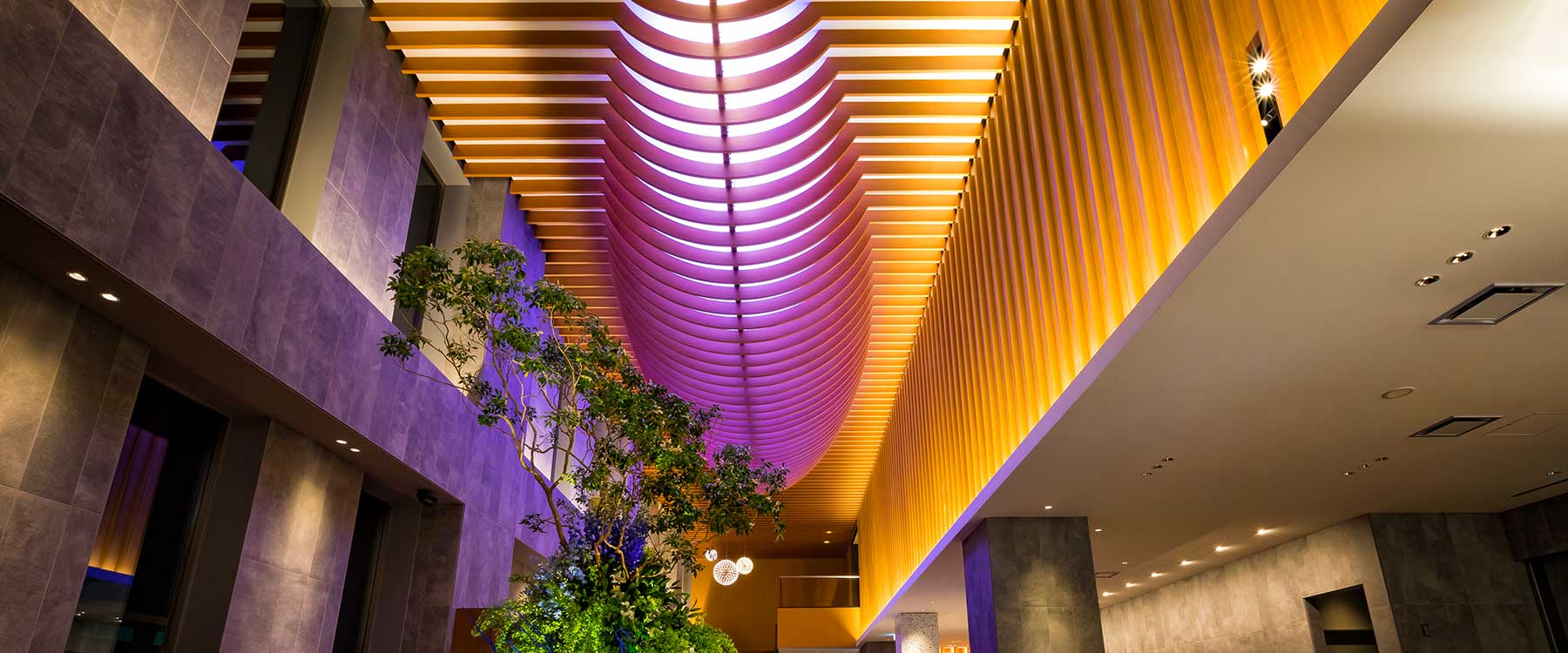 シックな雰囲気に包まれたロビー天井を見上げればまもなく乗り込む船の船底が。 乗船の手続きを済ませ、それぞれの船室へ。 モダンなデザインに、しばし非日常のときを味わう。