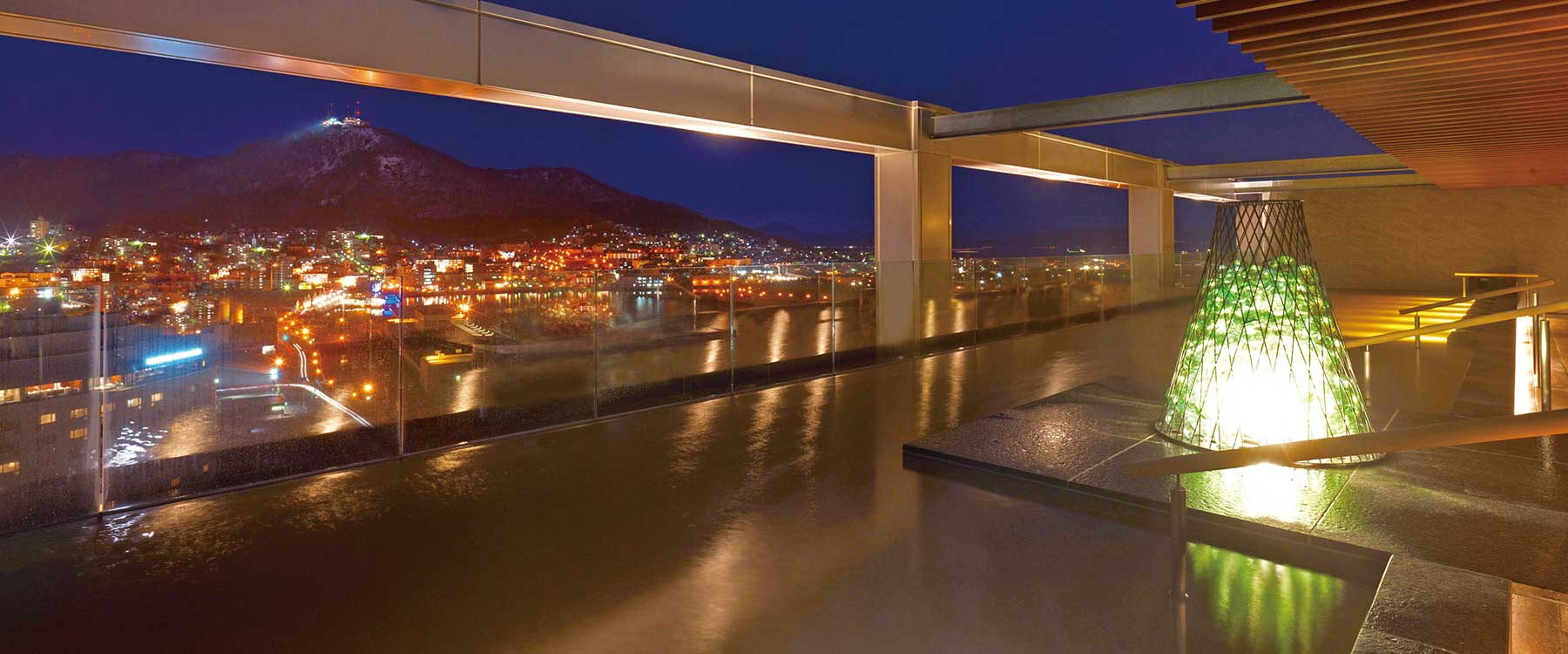 インフィニティスパを備えた最上階の甲板デッキに出れば濃紺の夜空を埋めつくす、北天の星たちが。 眼下には、穏やかな海原と雄大な函館山。たっぷりと湯水をたたえた天然温泉の温かさが、心のひだに染み込んでいく。