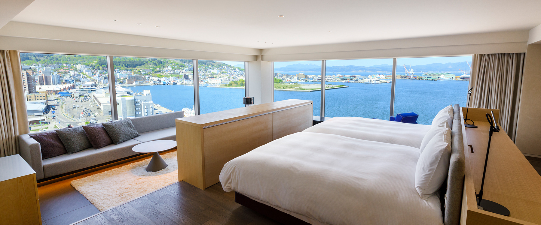 港町の風情と煌めき、微かに響く波音に包まれながらの夜時間。 選び抜いたこだわりの寝具と、ほのかなアロマの香りが深い夢の心地へといざなってくれる。